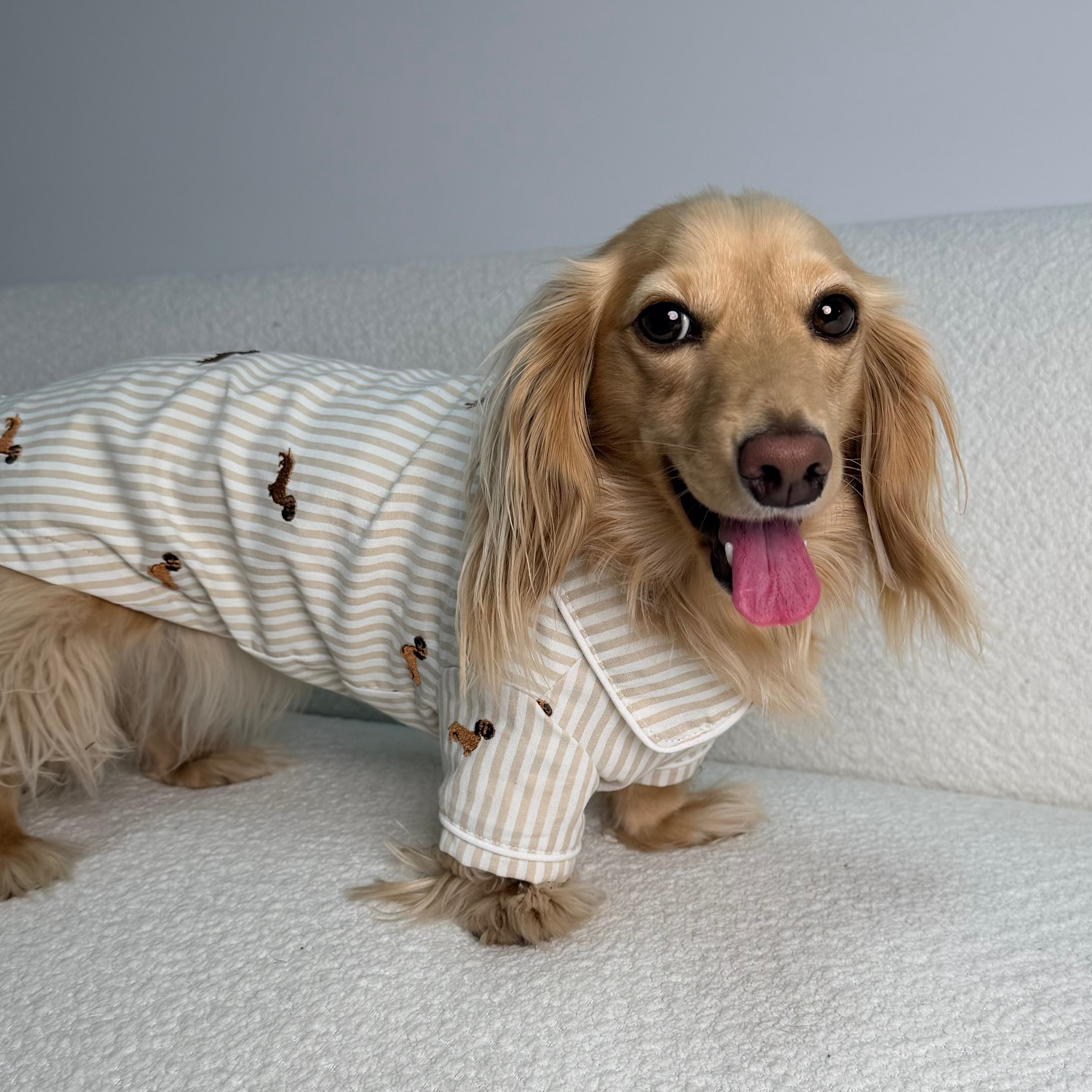Embroidered dachshund detailing